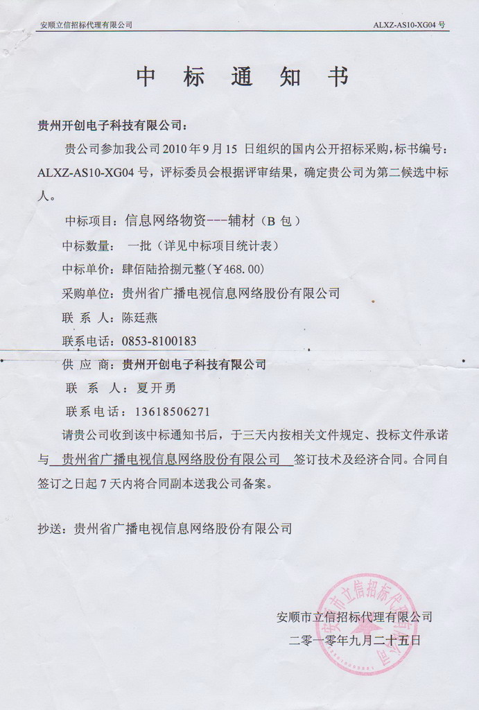 我公司中標(biāo)省廣電網(wǎng)絡(luò)公司輔材采購(gòu)